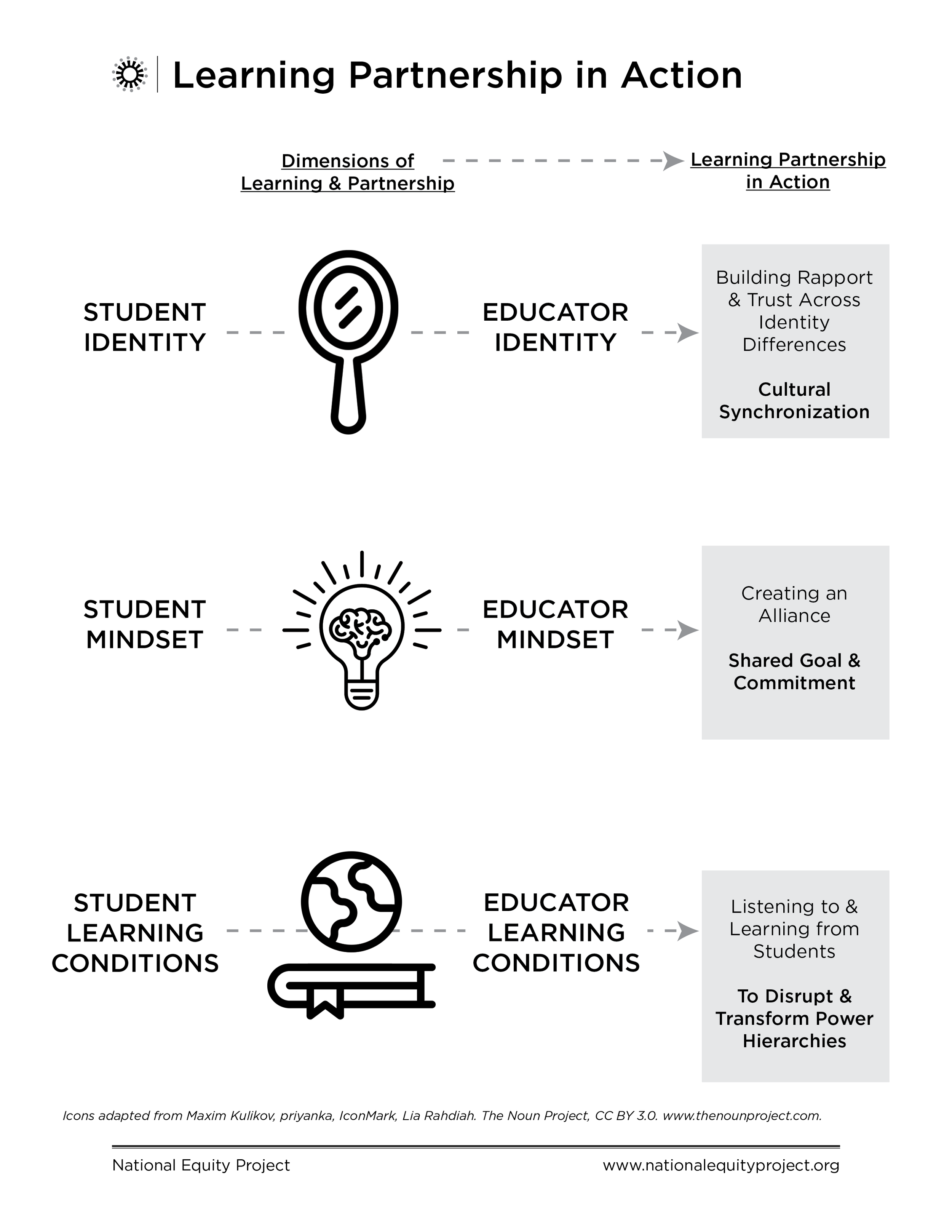 [Image Description: This graphic consists of two columns to demonstrate the partnership between students and educators in the 3 components of a learning partnership. Across the top of the graphic are the titles of the two columns. The left column reads, “Dimensions of Learning and Partnership” and includes a gray dotted arrow pointing to the title of the right column, “Learning Partnership in Action.”